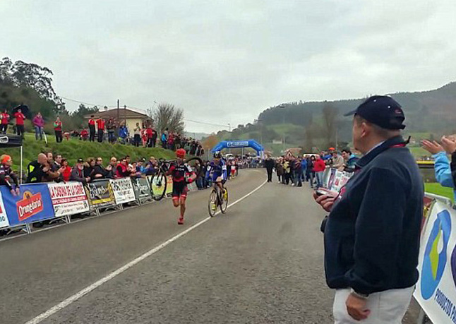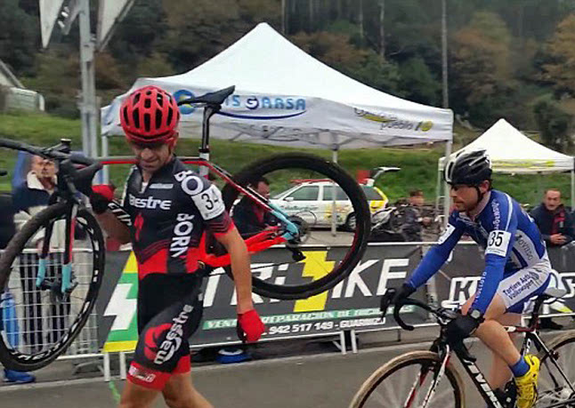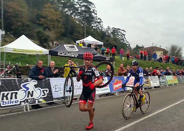 據(jù)英國《每日郵報》12月17日報道,在西班牙坎塔布里亞(Cantabria)舉行的自行車塞上,參賽選手伊斯梅爾·埃斯特班(Ismael Esteban)在接近終點的時候車輪胎被刺爆,但他并未放棄比賽,而是扛著賽車沖向終點。為了對其表示敬意,他后面的參賽選手放慢了速度,放棄超越他。